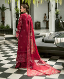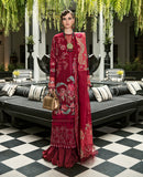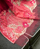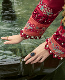 Intense and mystifying, this exquisite and enigmatic deep red dobby base canvas creates an eye catching cross stitch embroidery shirt adorned with fabulous Resham stitches, striking Maroori and meticulous Schiffili on front and sleeves. Aari stitches on chanderi net red dupatta with multiple peachy pink appliques and scarlet red borders present itself with tremendous elegance.