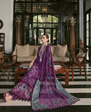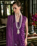 Eye-captivating Purple lawn canvas adorned with exuberance. Applique worked centre panel and Schiffili on sleeves and side shirt panels. Cool boysenberry dupatta on chanderi net with raw silk sage green side palloos. Cutwork on the shirt is a treat for lawn lovers.