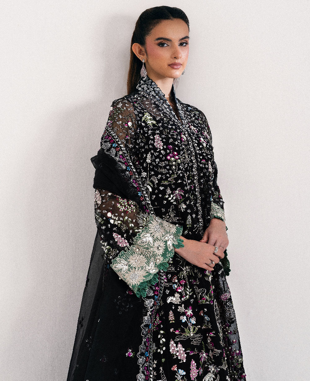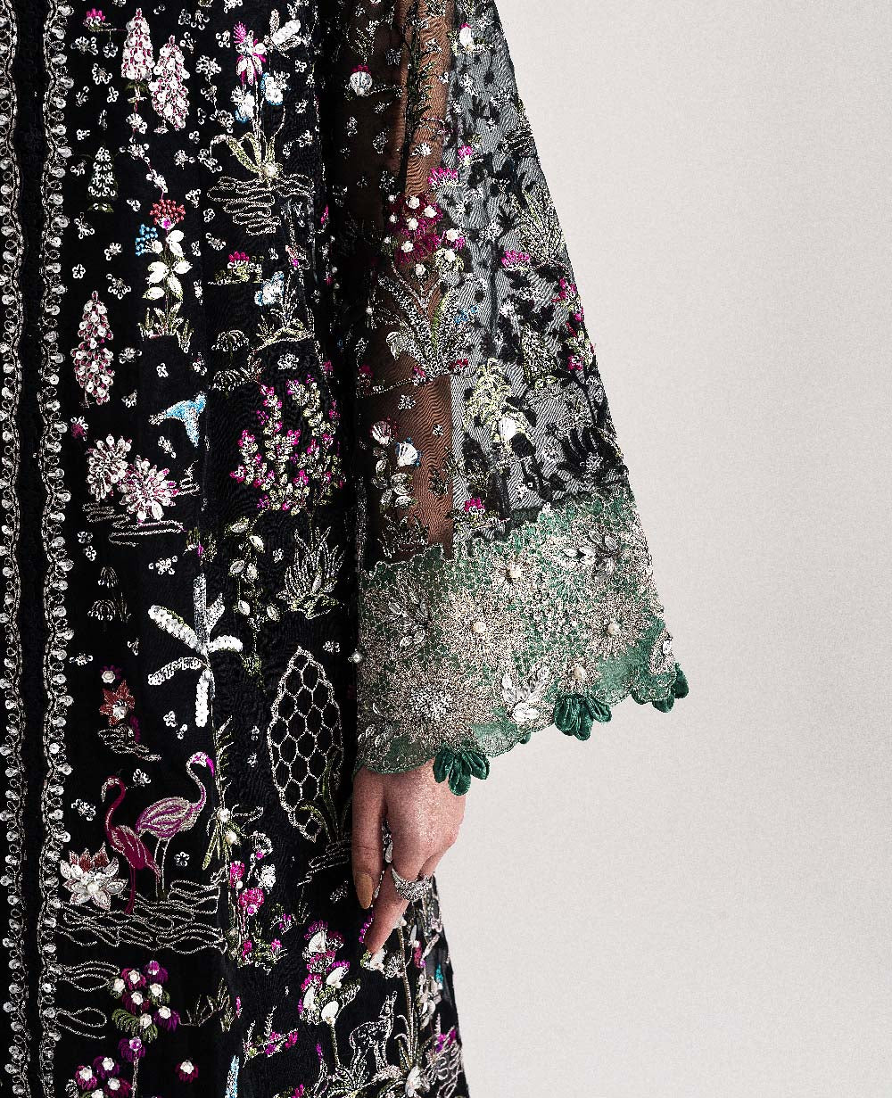 Includes: Shirt, Lehenga, Slip & DupattaA black, six-paneled organza shirt adorned with intricate shikargah motifs intertwined with delicate florals cascading across the panels. Serene blue arches complement two hem borders in green and hot pink, finished beautifully with lace. The shirt features a sequin collar, while the sleeves are richly decorated with sequins and floral embroidery, highlighted by a green border and looped detailing at the cuffs. The organza dupatta showcases a sequin spray at the center, framed by a four-sided floral border. Completing the ensemble are black raw silk lehnga trimmed with gotta borders at the hem.