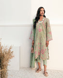 Includes: Shirt, Slip, Trouser and DupattaThis beautiful applique cut mid length shirt is paired with an sea green hued organza embroidered Dupatta and fitted pants. The shirt fabric is cotton net woven with shimmering gold tilla to add that perfect formal touch to your wardrobe.