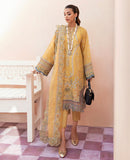 Delicately composed floral embroideries rendered in seaport and gold silk thread on a mustard yellow canvas. Layered with all round cut work embroidered dupatta accompanied with scalloped embroidered straight pants.