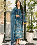 A subtle beautiful dreamy design rendered in Prussian Blue cotton net shirt with hues of blue Resham and tilla having cutwork details on hemline. Paired with tonal embroidered dupatta with intricate patchwork makes this whole look de tout beauté accompanied with detailed viscose straight pants. A stellar look for any occasion, this design makes a grand statement.