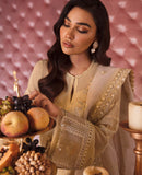 A creamy lemon chiffon ensemble is vivified with beautiful self-colored embroidery. The daman is adorned with geometrical boxes along with floral embroidery. It has an organza dupatta and appliqué cut border on its palus. The pants are straight-cut with exquisite details that add a touch of feminine grace to this chic outfit.