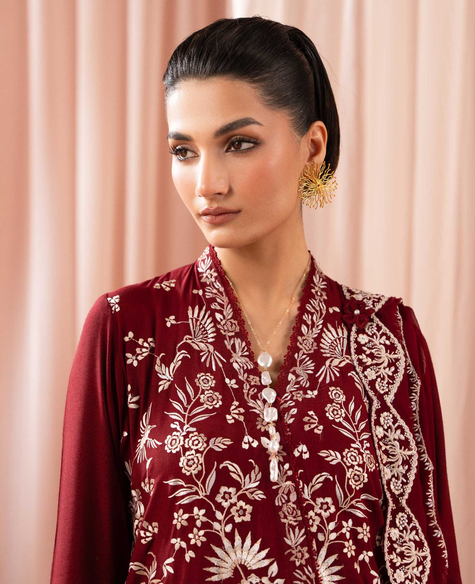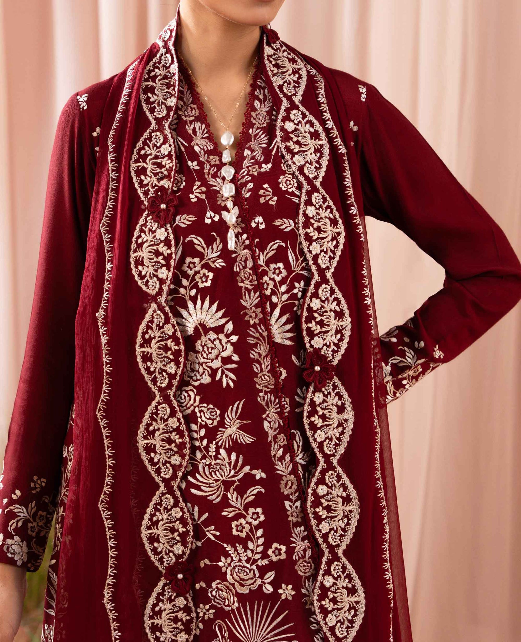 Includes: Shirt, Shalwar & DupattaA striking deep red raw silk angrakha, elevated with exquisite Parsi garra embroidery in subtle white and cream hues, lending the ensemble a beautifully restrained elegance. The rich texture of the angrakha is balanced by a tailored grip dhakka shalwar adding depth and a confident, statement-making structure to the silhouette. Finished with a coordinated chiffon dupatta, delicately embroidered to mirror the artistry of the outfit, this look embodies timeless craftsmanship with a modern, regal sensibility effortless, graceful and undeniably refined.