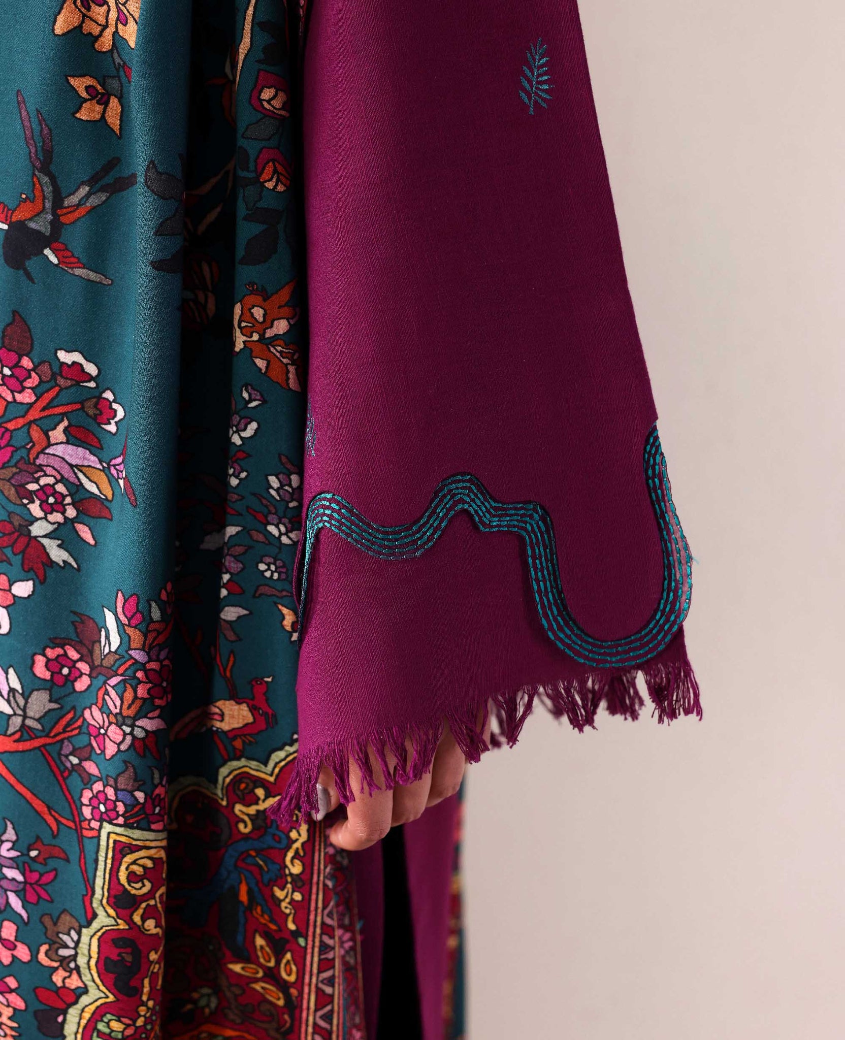 Wrapped in winter elegance: a long plum khaddar shirt adorned with Shikargah-inspired embroidery in striking teal, paired with chic culottes for a modern, effortless silhouette. Finished with a contrasting teal Twill Marina shawl, this ensemble blends heritage weaves with contemporary charm, quietly luxurious, beautifully detailed, and made to stand out.